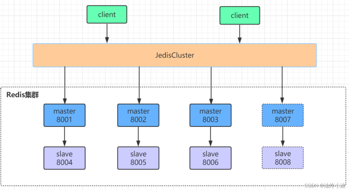 我们在原始集群基础上再增加一主(8007)一从(8008),增加节点后的集群参见下图,新增节点用虚线框表示