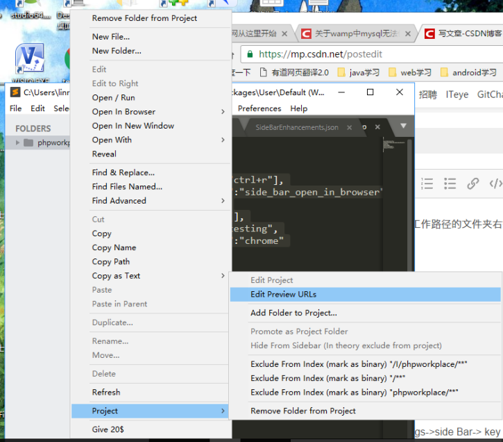 3、使用sublime打开你的php工作路径,选择工作路径的文件夹右键--->project-->Edit preview URLs。在输入窗口中写下如下代码