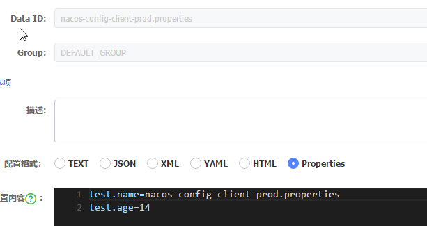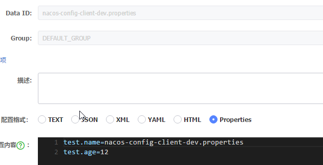 在nacos server分别创建${application.name}-dev.properties、${application.name}-test.properties、${application.name}-prod.properties三个有配置文件