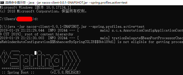 启动windows命令行并进入到D盘下,执行java -jar nacos-client-0.0.1-SNAPSHOT.jar --spring.profiles.active=test