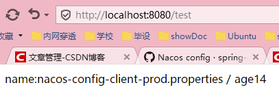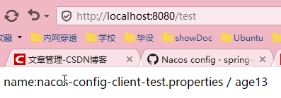 请求 http://localhost:8080/test得到下图,显然nacos-config-client-test.properties生效