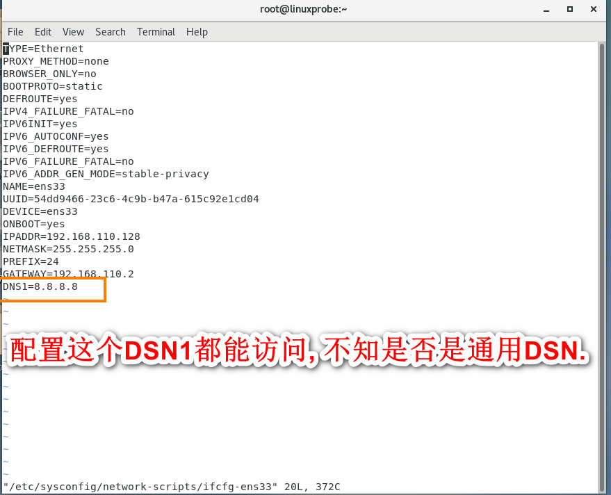注意:IP地址、子网掩码、网关信息来自虚拟机NAT模式的默认配置,DNS来自主机的首选DNS