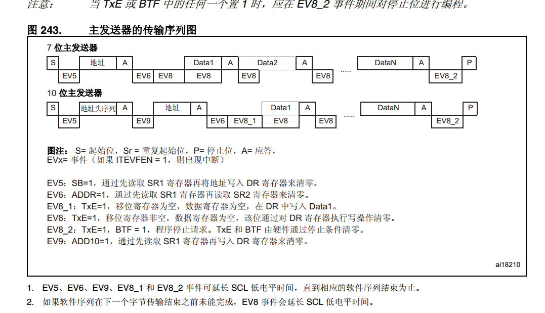 仔细研究了下stm32 的reference manual (文档ID 018909第4版) 第654页(如果看不到本文图片的,可以自行下载reference manual, 不同的器件对应的文档ID可能不一样, 可以在目录-- I2C--主发送器里面找到对应的描述. 如果文档版本比较老, 可以下载最新版本的manual, 和对应的勘误表)