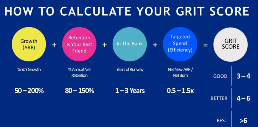 第二类企业处于高速扩张期,通过ARR超过1亿美金。这时可以对照下图计算自己的“坚韧指数(GRIT Score)”。可以分别对公司的ARR增长率、净客户留存率、现金Runway的时间以及资本收入效率,进行加权打分。