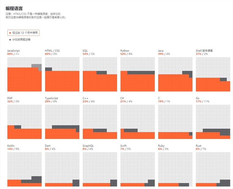 JavaScript 是最受欢迎的语言 – 69% 的受访者在过去 12 个月中使用过它,而 39% 的受访者将其指定为他们的主要编程语言。
