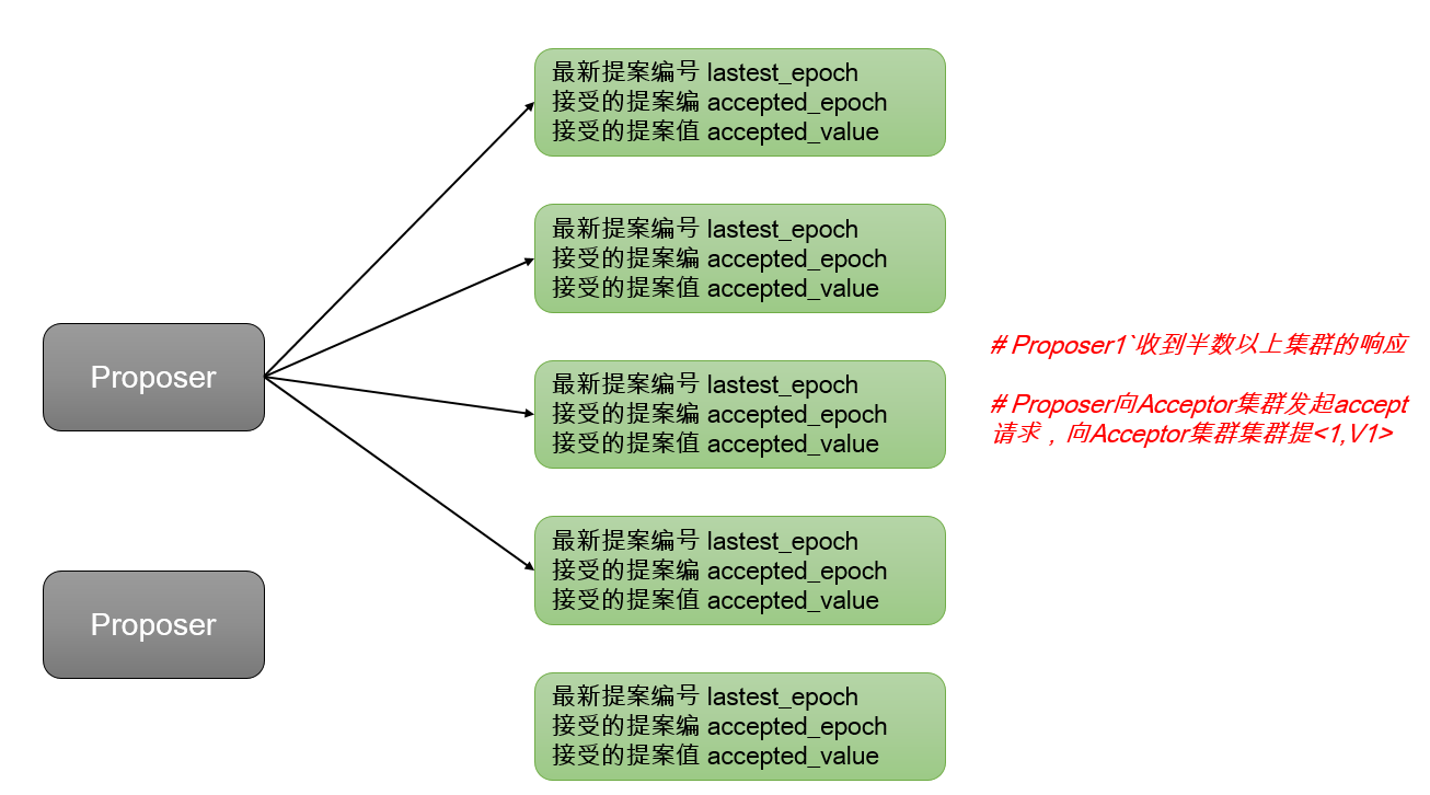 Proposer1 开始向Acceptor集群发起accept请求,提交<prepare_epoch,V1>