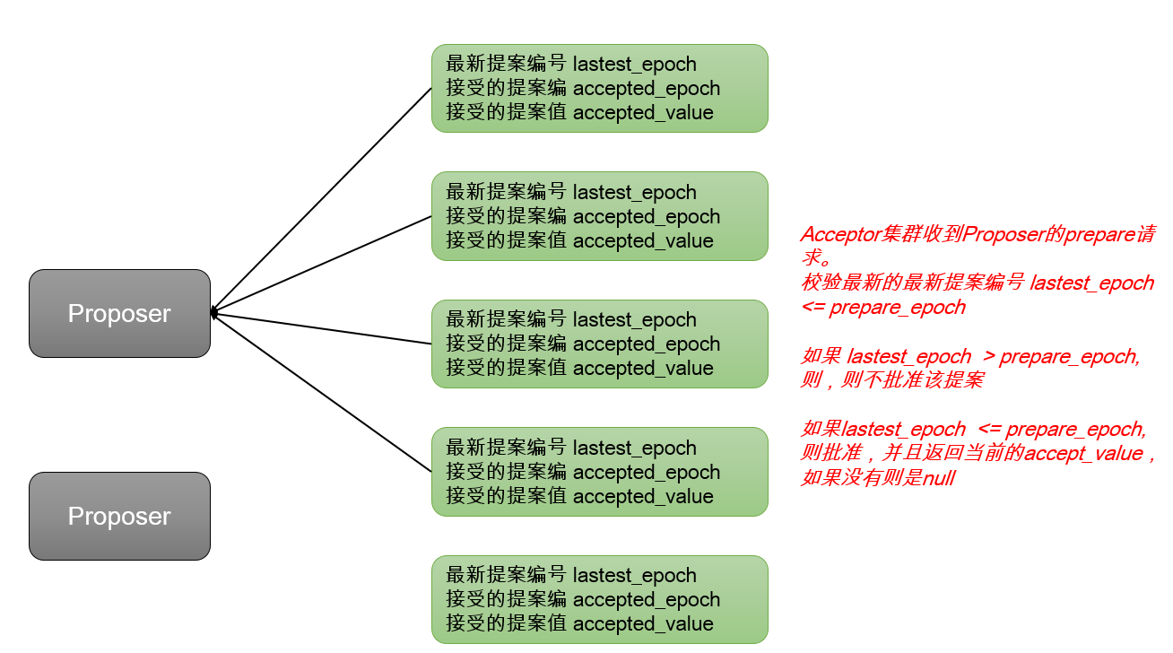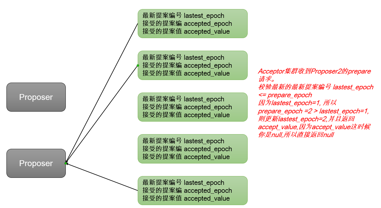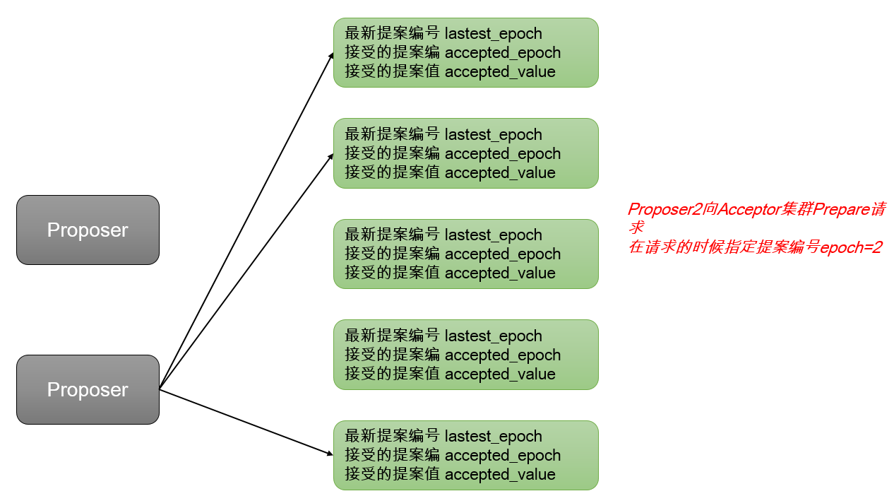 这个时候,另外一个Proposer2也开始向Acceptor集群发起Prepare请求,请求的提案编号是epoch=2(prepare_epoch=2)