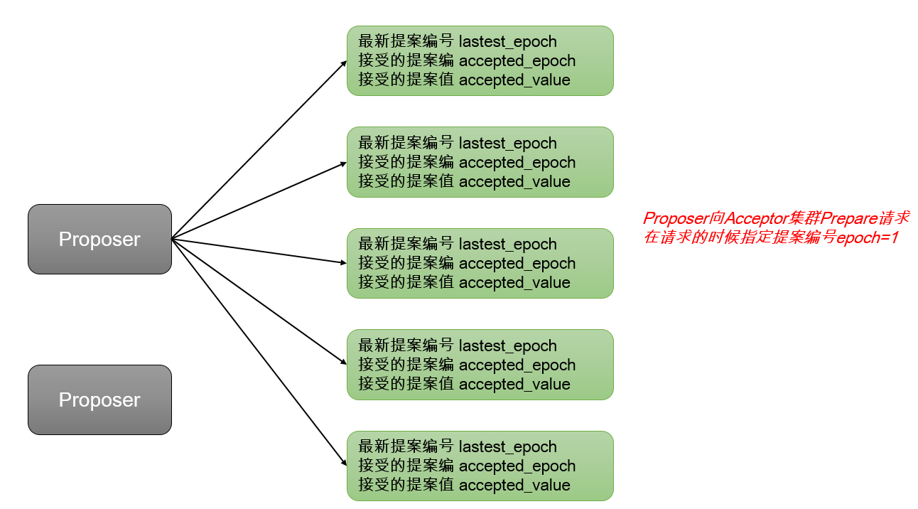 Proposer选择一个提案编号为epoch,向Acceptor集群中的成员发送请求