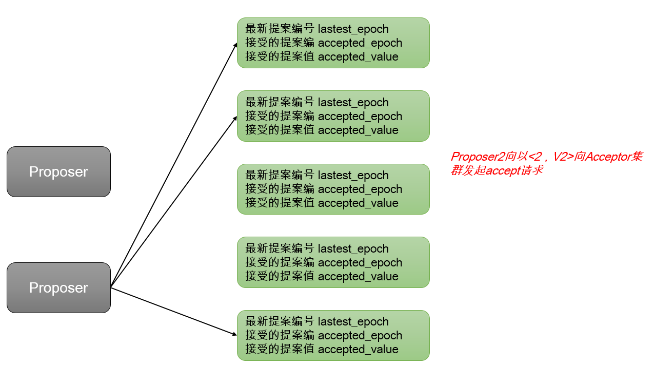 Proposer2 开始向Acceptor集群发起accept请求,提交<prepare_epoch,V2>