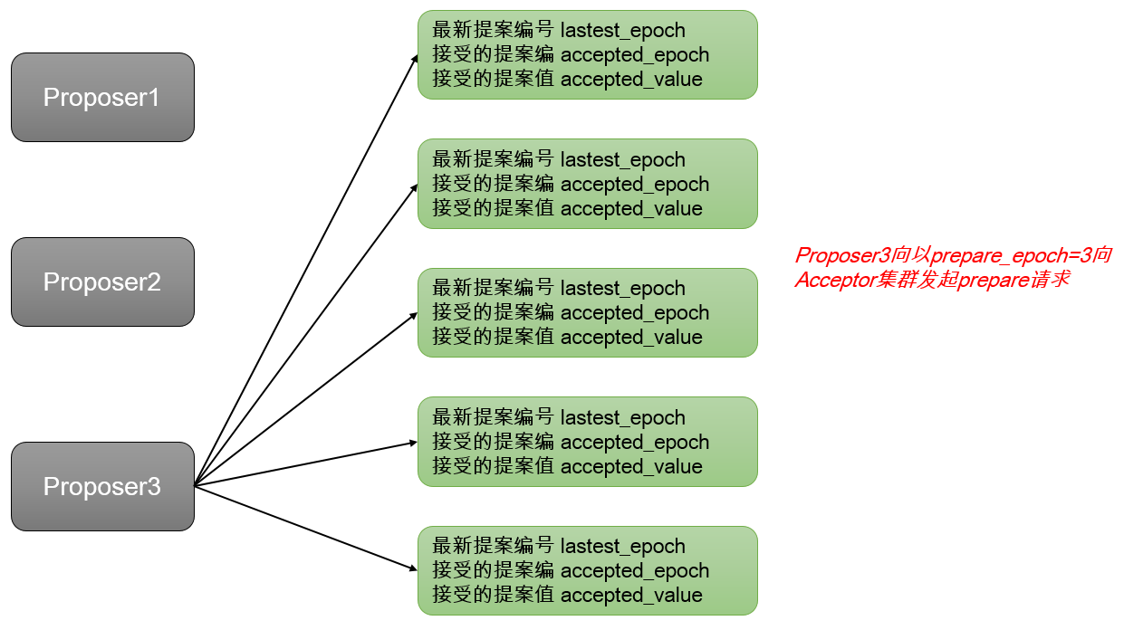 Proposer3向以prepare_epoch=3向Acceptor集群发起prepare请求