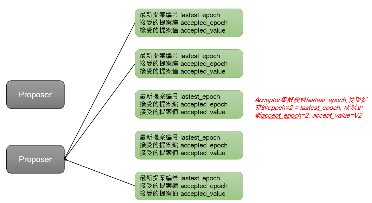 Acceptor集群校验lastest_epoch,发现提交的epoch=2 = lastest_epoch, 所以更新accept_epoch=2, accept_value=V2.