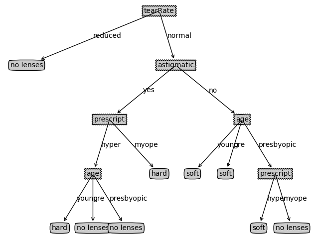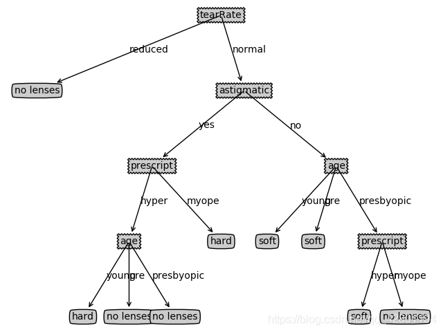 着决策树的不同分支,我们可以得到不同患者需要佩戴的隐形眼镜类型,从该图中我们可以得到,医生最多需要问四个问题就可以确定出患者需要佩戴何种隐形眼镜。