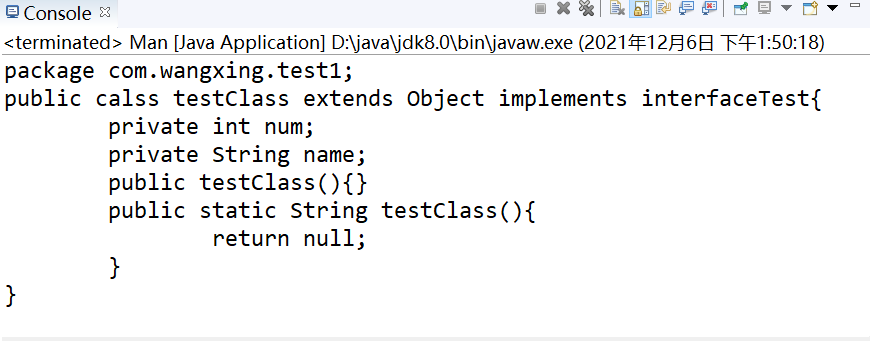 例如:package com.wangxing.test1; import java.lang.reflect.Constructor; import java.lang.reflect.Field; import java.lang.reflect.Method; import java.lang.reflect.Modifier; public class Man { public static <Constructo> void main(String args[]) throws Exception { // 得到反射对象 Class class1 = Class.forName("com.wangxing.test1.testClass"); Package pack = class1.getPackage(); String packname = pack.getName(); System.out.println("package" + "\t" + packname + ";"); // 得到类的修饰符 String Classstr = Modifier.toString(class1.getModifiers()); // 得到父类名称 String superName = getname(class1.getSuperclass().getName()); // 得到类名称 String str = class1.getName(); String classname = getname(str); // 得到接口对象 Class InterClass = class1.getInterfaces()[0]; String Intername = getname(InterClass.getName()); System.out.println(Classstr + " " + "calss" + " " + classname + " " + "extends" + " " + superName + " " + "implements" + " " + Intername + "{"); // 得到成员变量对象 Field[] Fields = class1.getDeclaredFields(); for (Field filed : Fields) { // 得到成员变量的修饰符 String filedxiushi = Modifier.toString(filed.getModifiers()); // 得到成员变量的种类 String bltype = getname(filed.getType().getName()); // 得到成员变量名称 String blname = filed.getName(); System.out.println("\t" + filedxiushi + " " + bltype + " " + blname + ";"); } // 得到构造方法 Constructor gouzao = class1.getConstructors()[0]; String gouzaoxiushi = Modifier.toString(gouzao.getModifiers()); String gouzaoname = getname(gouzao.getName()); System.out.println("\t" + gouzaoxiushi + " " + gouzaoname + "(){}"); //得到实例方法 Method method=class1.getDeclaredMethods()[0]; String methodxiushi=Modifier.toString(method.getModifiers()); String methndReturn=getname(method.getReturnType().getName()); String methodname=getname(class1.getName()); System.out.println("\t"+methodxiushi+" "+methndReturn+" "+methodname+"(){"); System.out.println("\t"+"\t"+"return null;"); System.out.println("\t"+"}"); System.out.println("}"); } private static String getname(String str) { return str.substring((str.lastIndexOf(".") + 1)); } }package com.wangxing.test1; public class testClass extends Object implements interfaceTest{ private int num; private String name; //常见构造方法 public testClass(){} //实例方法 public static String shilivoid(){ return null; } }