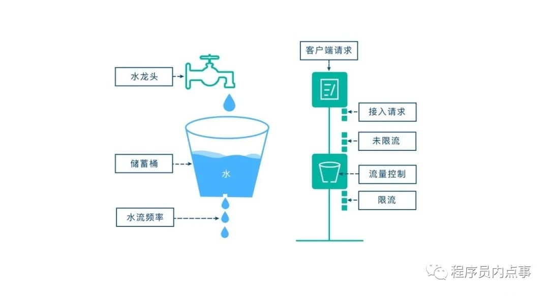 漏桶算法思路很简单,我们把水比作是请求,漏桶比作是系统处理能力极限,水先进入到漏桶里,漏桶里的水按一定速率流出,当流出的速率小于流入的速率时,由于漏桶容量有限,后续进入的水直接溢出(拒绝请求),以此实现限流。