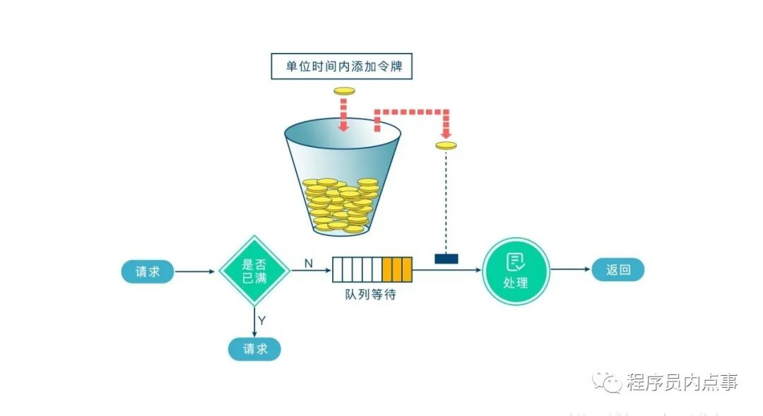 系统会维护一个令牌(token)桶,以一个恒定的速度往桶里放入令牌(token),这时如果有请求进来想要被处理,则需要先从桶里获取一个令牌(token),当桶里没有令牌(token)可取时,则该请求将被拒绝服务。令牌桶算法通过控制桶的容量、发放令牌的速率,来达到对请求的限制。