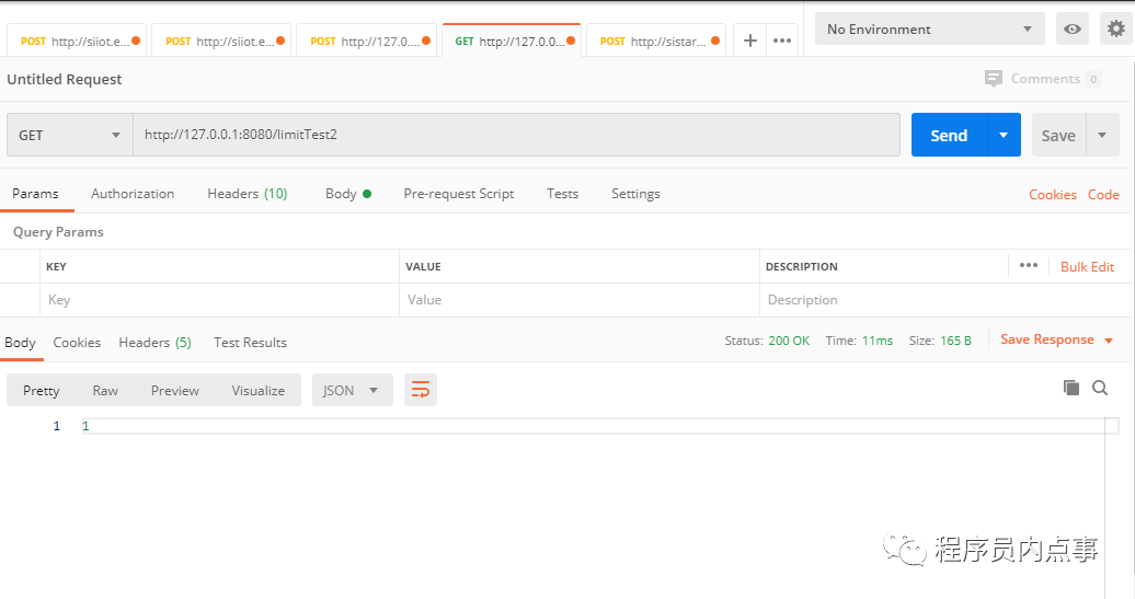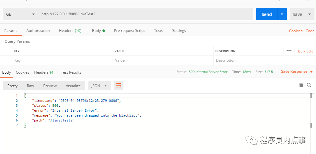测试「预期」:连续请求3次均可以成功,第4次请求被拒绝。接下来看一下是不是我们预期的效果,请求地址:http://127.0.0.1:8080/limitTest1,用postman进行测试,有没有postman url直接贴浏览器也是一样。
