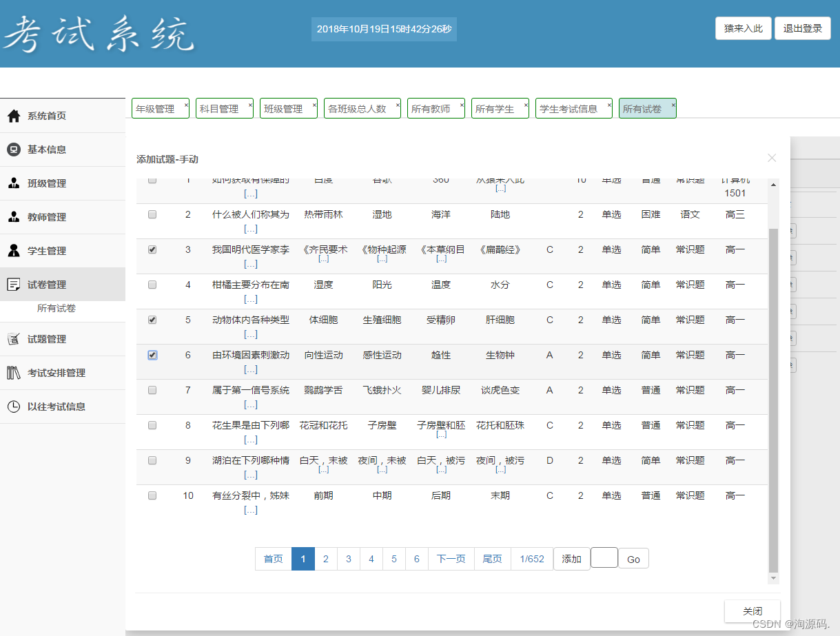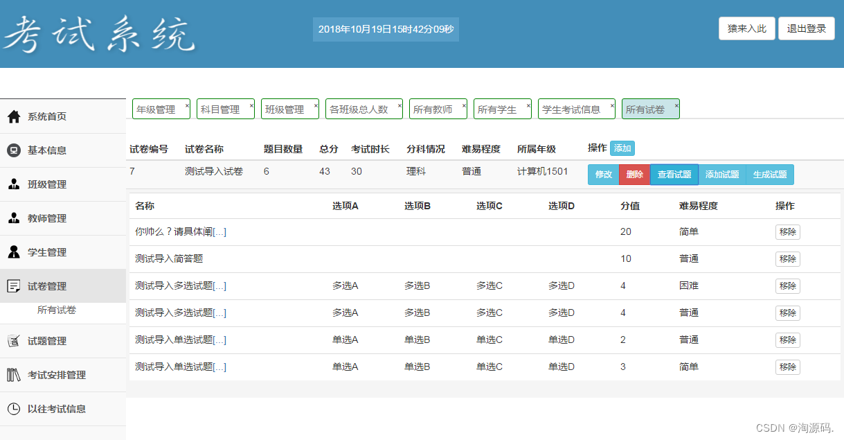 学生在线考试系统功能比较完善,项目配有完整的源码、数据库文件。支持单选、多选、简答题型,试题可以批量导入,导入时可选择多种方式导入,比如导入到试题库,导入到试卷中或者导入到新建试卷中等,后台角色分为教师和管理员。