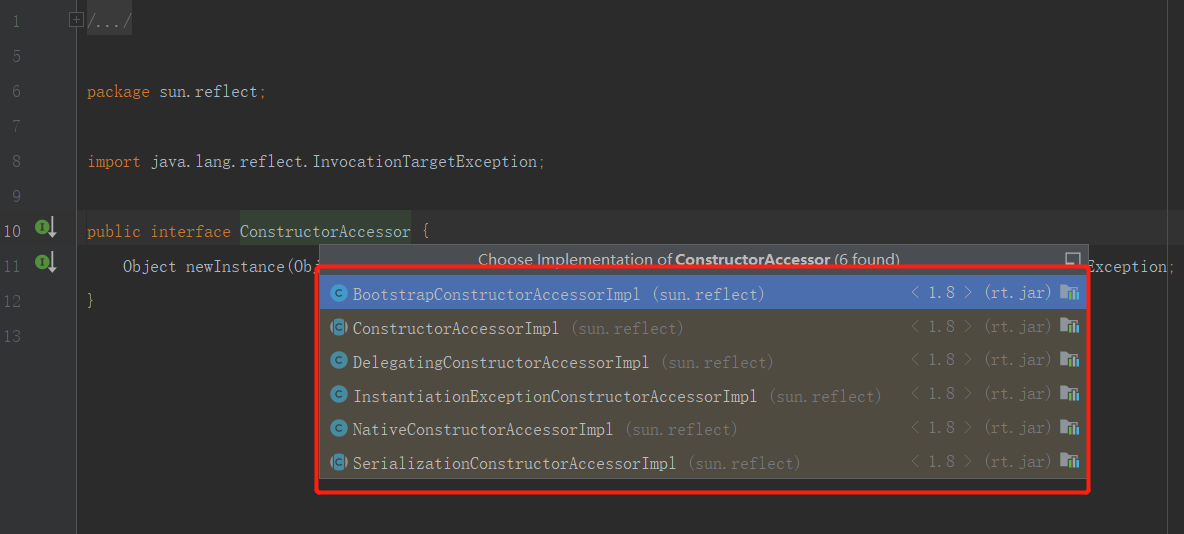 构造函数声明类 ConstructorAccessor 是一个接口,如下图所示: