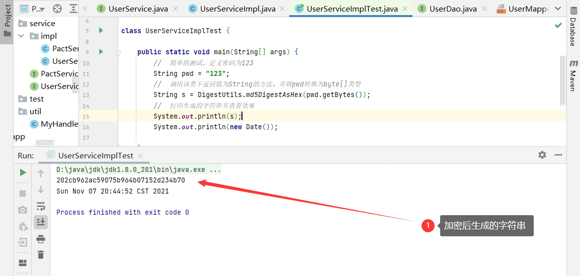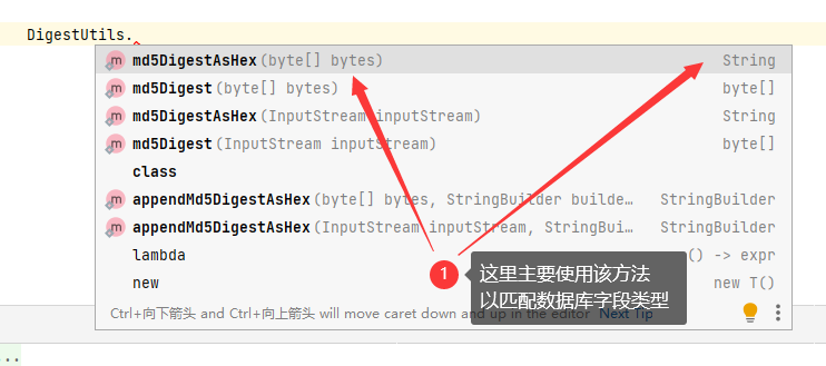 这里我们主要使用该类下 返回值为 String 的 md5DigestAsHex (byte[] bytes) 方法。