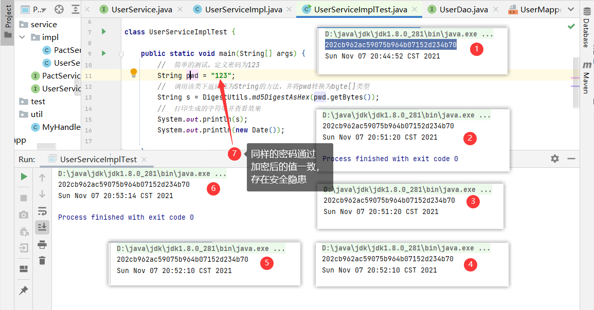 但是细心的朋友在测试时会发现,固定的密码每次通过这种方式加密后所生成的字符串都是一致的:(如图所示)