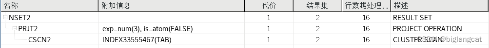 物理执行计划中,名称为该计划执行的操作符,代价为执行时间,单位为毫秒,结果集为预估行数,行数据处理长度为每行的字节长。
