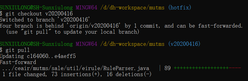① 首先 (git checkout 分支名称) 切换到 v20200416 分支,然后(git pull)更新分支代码