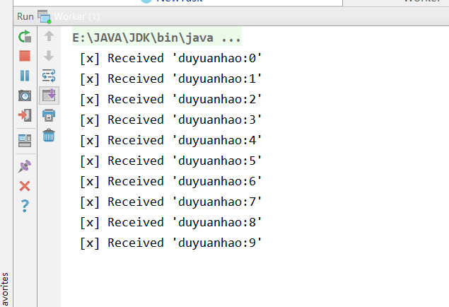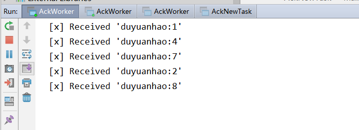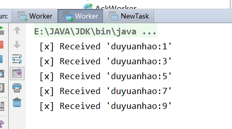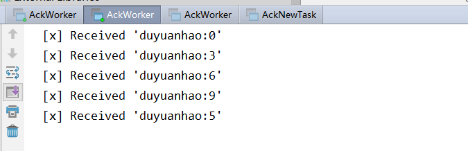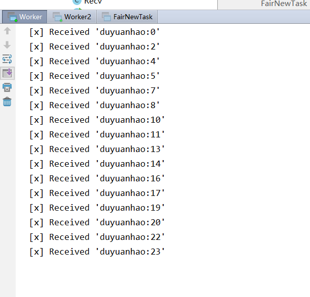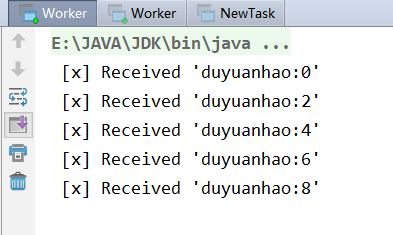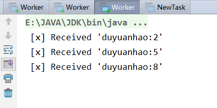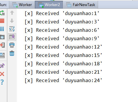 我们发现,通过增加更多的工作程序就可以进行并行工作,并且接受的消息平均分配。注意的是,这种分配过程是一次性分配,并非一个一个分配。