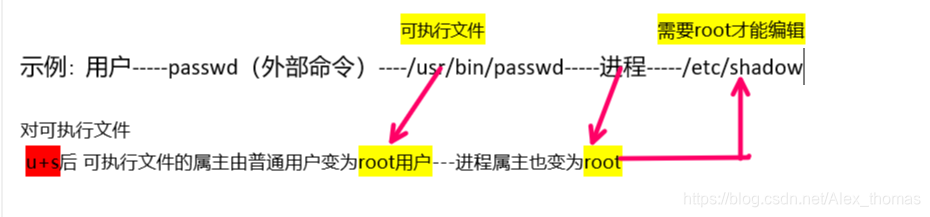 示例:非root用户更改用户密码需执行命令passwd,passwd为外部命令,可执行文件为/usr/bin/passwd。当开始调用可执行文件后 此文件会变为进程 此时可执行文件的属主就是进程的属主,但进程去编辑用户密码配置文件(/etc/shadow)需要属主为root用户,否则无法编辑密码配置文件。但对passwd的可执行文件添加 u+s权限后 文件的属主就会为root用户 ,相应进程属主也跟着变为root,从而编辑用户的密码配置文件修改密码。