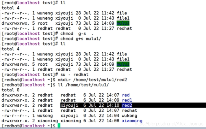 示例:在mulu1中创建其他文件 ,目录的属组为xiyouji,对该目录文件设置g+s权限后,在该目录下创建的其它文件的属组也为xiyouji。