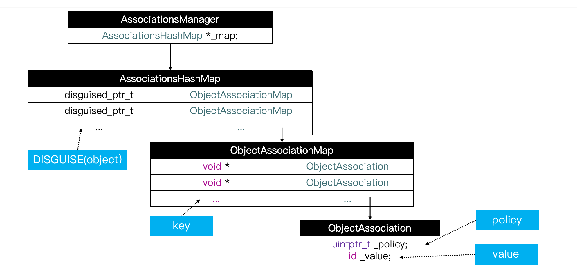- 一个单例的 Hash 表,存储 disguised_ptr_t 和 ObjectAssociationMap 之间的映射。