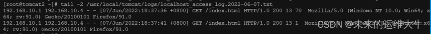 [root@tomcat2 ~]# tail -2 /usr/local/tomcat/logs/localhost_access_log.2022-06-07.txt