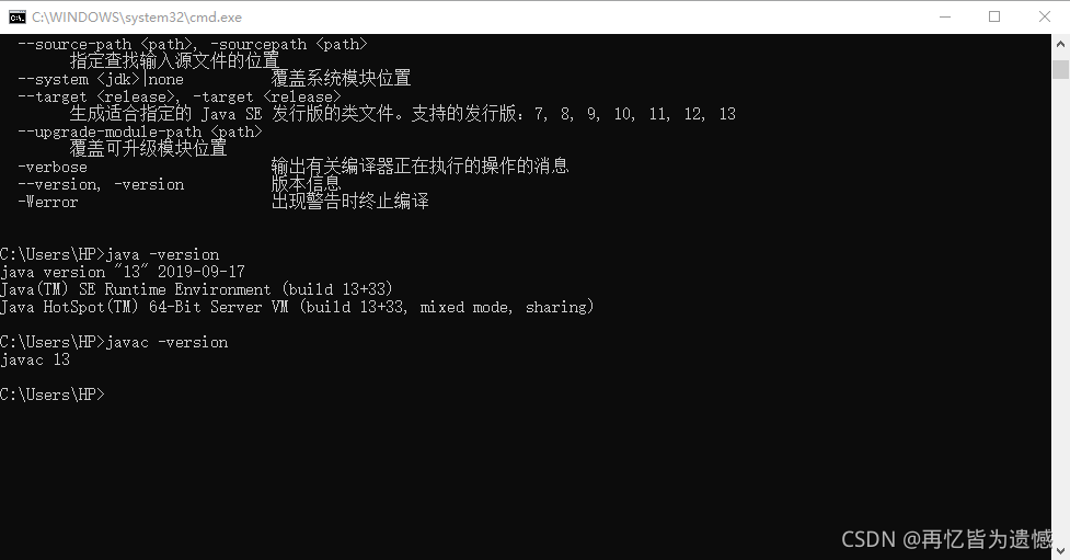 保存设置之后再重启cmd,输入java,javac,java -version,javac -version,如果显示我上面的内容就成功了。