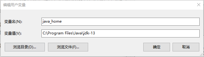在用户变量中,添加新变量,变量名为java_home,变量值为C:\Program Files\Java\jdk-13。注意:这是我的Java文件所在地址,按自己下载文件的地址来。变量值可以点击浏览目录直接打开。
