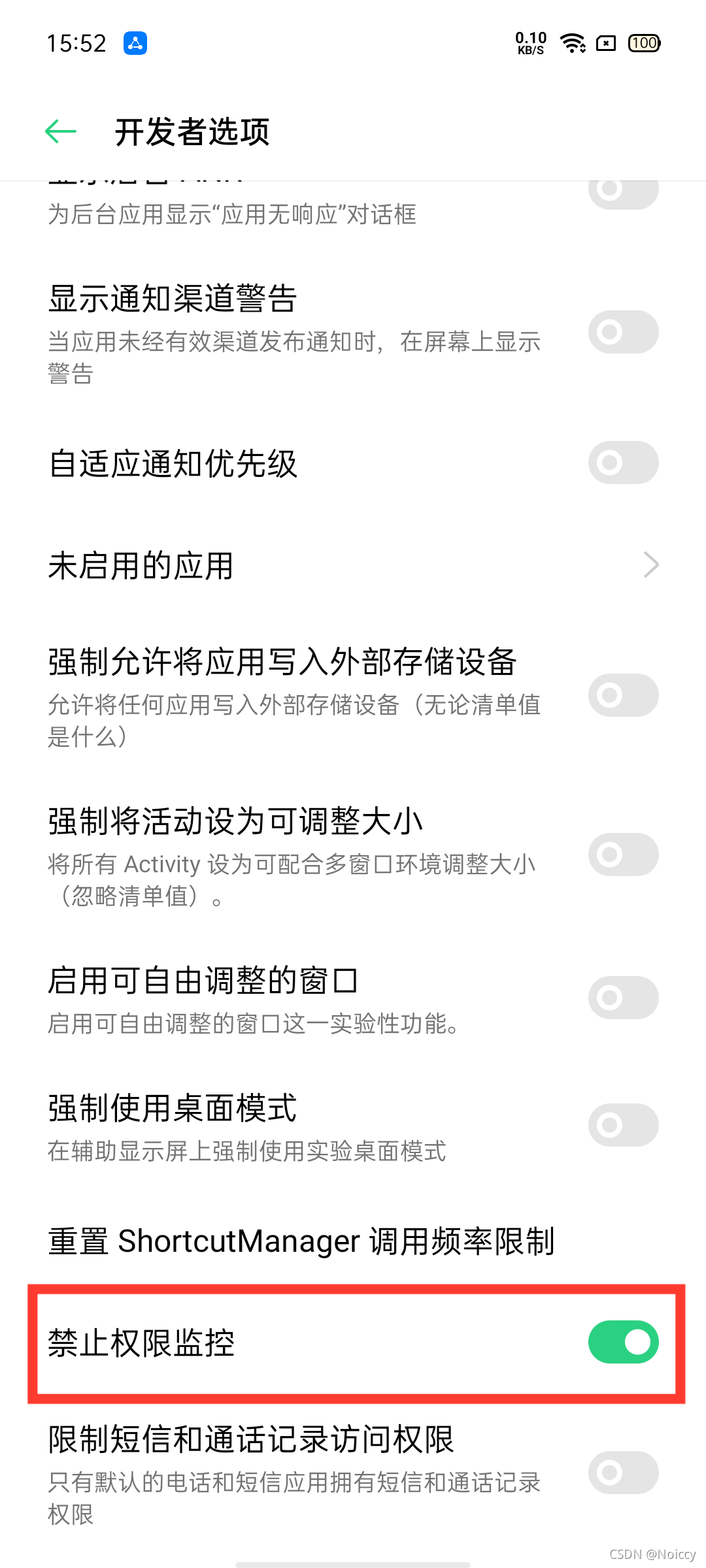 3、参考Realme 3 Pro : Error : java.lang.SecurityException: Permission denial: writing to settings requires:android.permission.WRITE_SECURE_SETTINGS · Issue #13802 · appium/appium · GitHub ,找到解决办法,即打开开发者选项中的“禁止权限监控”选项