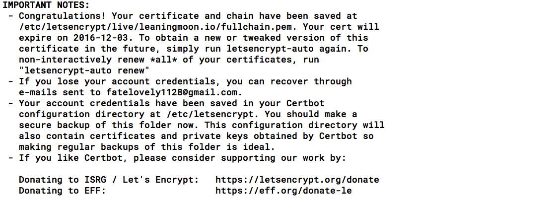./letsencrypt-auto certonly -a webroot --webroot-path=/usr/share/nginx/html -d leaningmoon.io # 可以使用多个 -d 添加多个域名