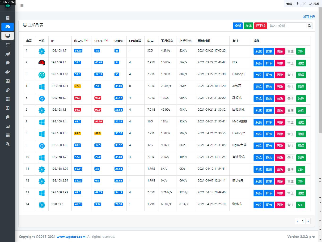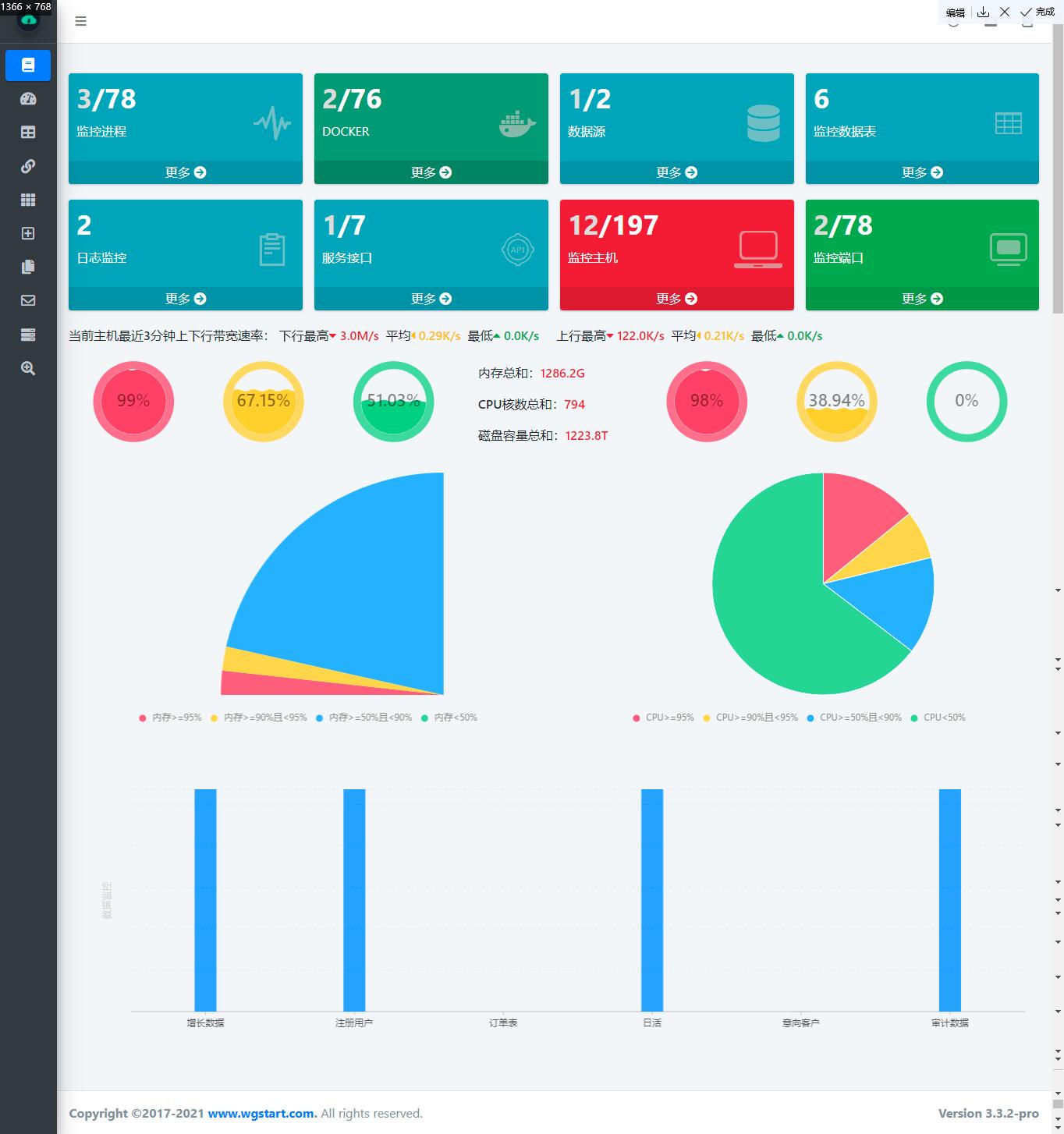 国人开源的新锐监控工具,轻量高性能,可快速安装部署,极易上手。server采用springboot微服务架构开发,跨平台,单节点可支持1000+主机监控。核心采集指标包括:主机系统信息,网络流量,CPU状态,CPU温度,内存状态,磁盘空间和IO监控,硬盘smart健康检测,系统负载,大屏可视化,ES集群状态,业务数据监控(mysql,oracle,pgsql等),服务接口检测,应用进程监控,网络拓扑图,端口监控,日志文件监控,docker监控,Web SSH,堡垒机,告警信息(邮件微信钉钉短信等)推送。