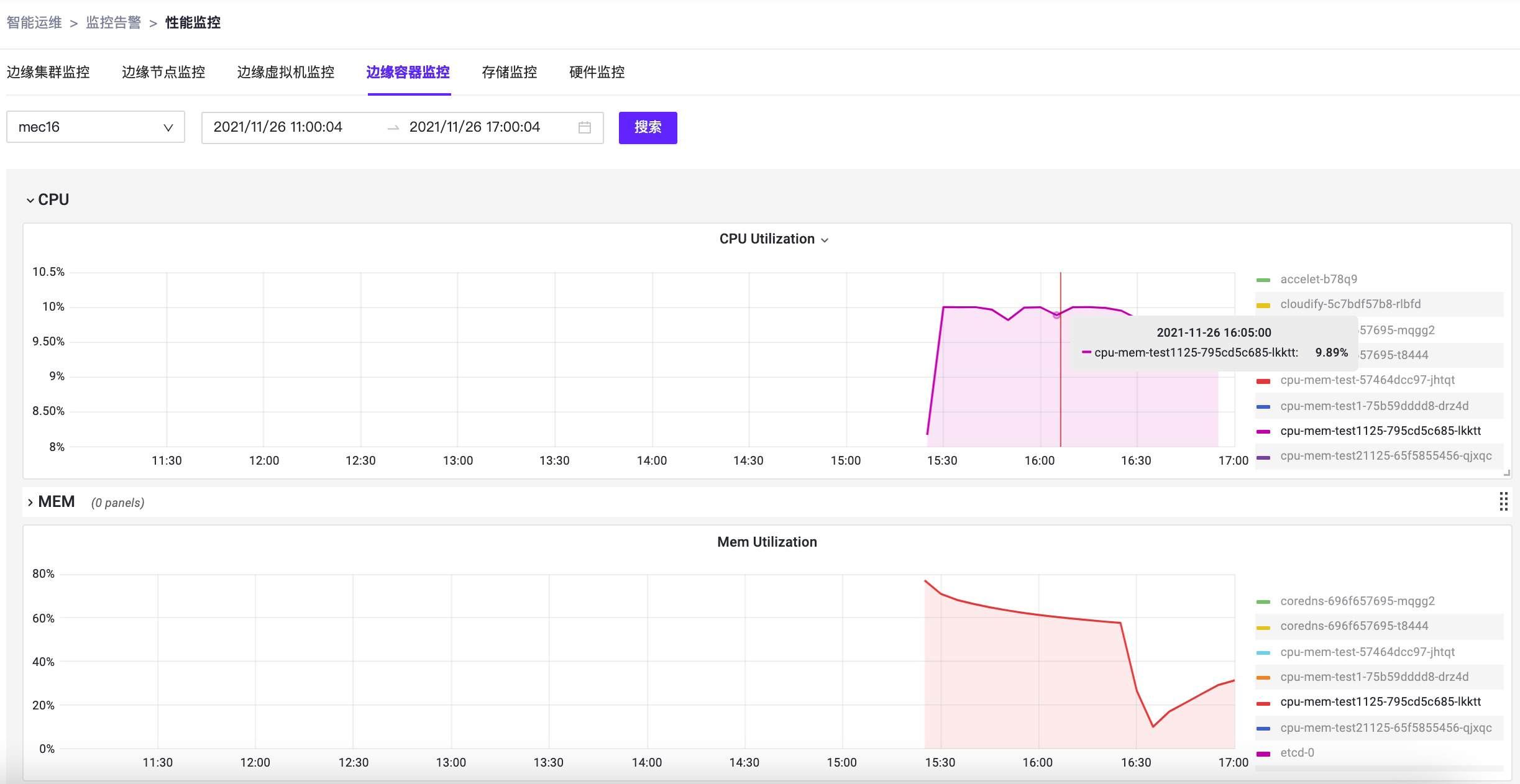 对应系统上可以看到智能运维 > 监控告警 > 性能监控 - [边缘容器监控]的pod容器cpu-mem-test1125-795cd5c685-lkktt的CPU利用率-CPU Utilization增高