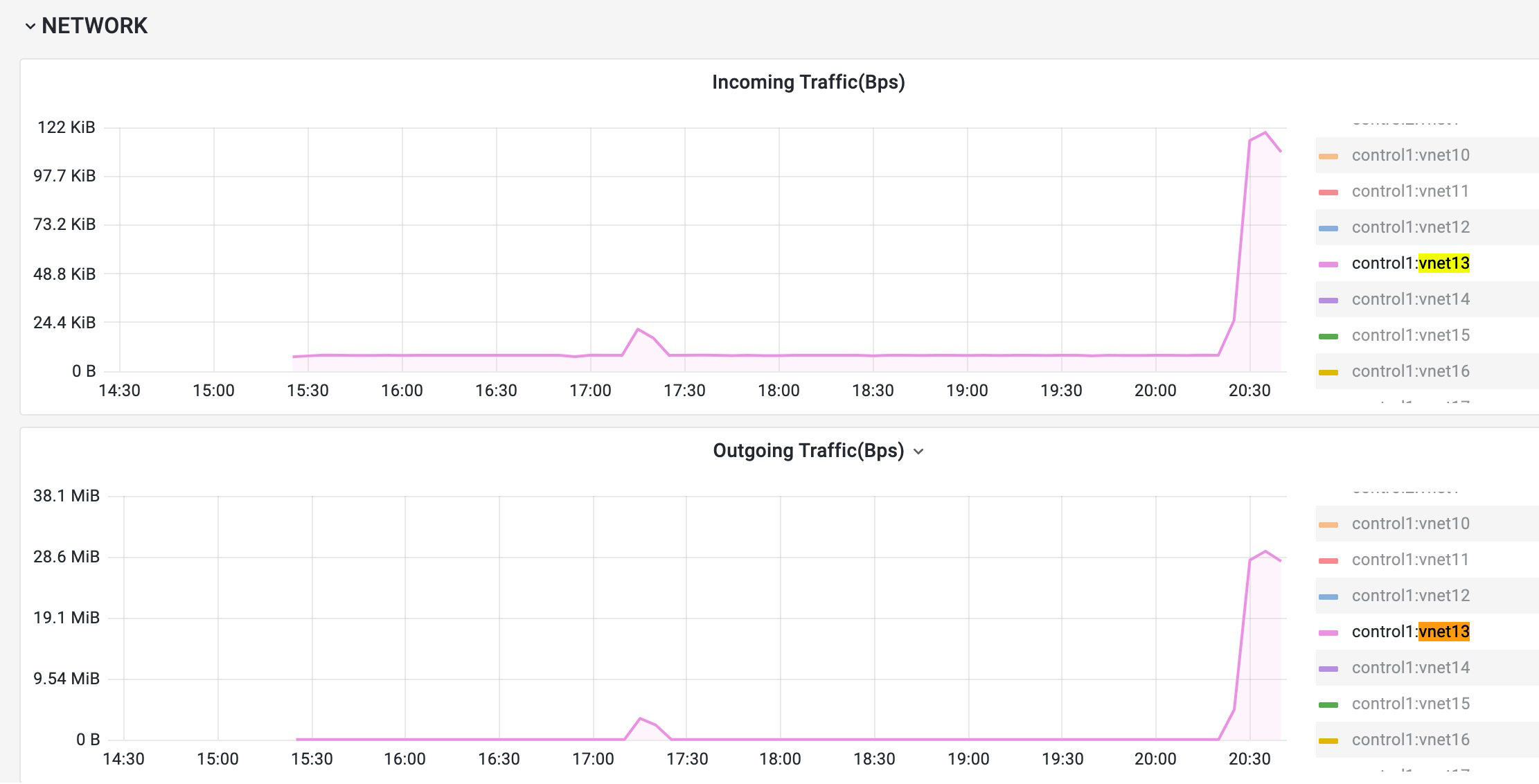 2.4 在性能界面会看到这两个pod所在的物理节点对应的网卡出现较大流量数据