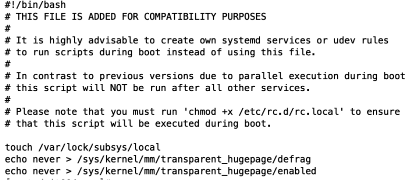 echo "echo never > /sys/kernel/mm/transparent_hugepage/defrag" >> /etc/rc.local
