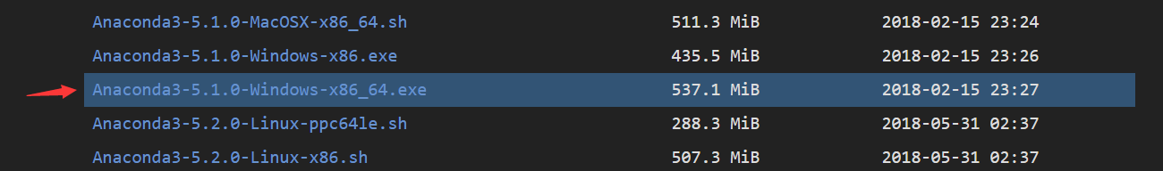 人生苦短,我选择在在清华园镜像中下载Anaconda,因为我的电脑是Window10 64位,所以我选择的版本是Windows-x86_64后缀的,至于版本号,可以自己选择,我选的是Anaconda3-5.1.0。