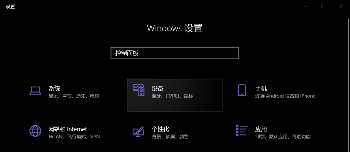 1.1 、首先在Windows设置中搜索控制面板(按Win键,然后点击左下方的设置按钮就可以到Windows设置页面)。