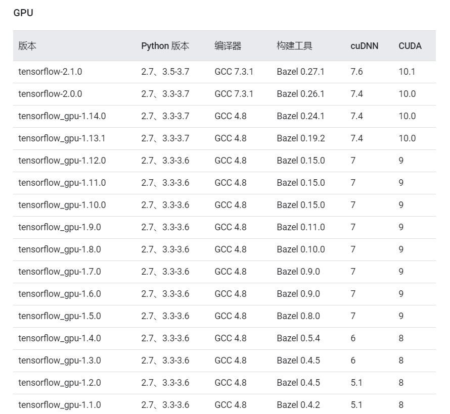 由下面的TensorFlow版本和CUDA版本对应图可以看出,适用于CUDA版本为9的TensorFlow-gpu版本为1.5-1.12之间,我选择1.8进行安装。