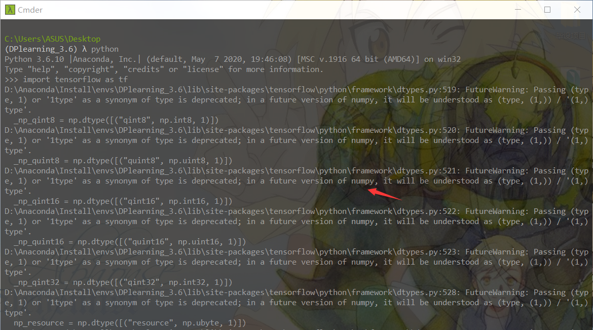 TensorFlow下载安装结束之后,使用import tensorflow as tf命令来看是否成功安装(现实总是很骨感,报错了orz),可以看到报错的内容主要是关于numpy,但我相信“方法总比困难多”,通过网上查找解决方法,了解到是因为numpy版本太高了,我重新安装numpy=1.16.0版本的就解决了。(不同的Tensorflow版本可能对应的numpy版本不同,小伙伴们可以多试几个numpy版本)。