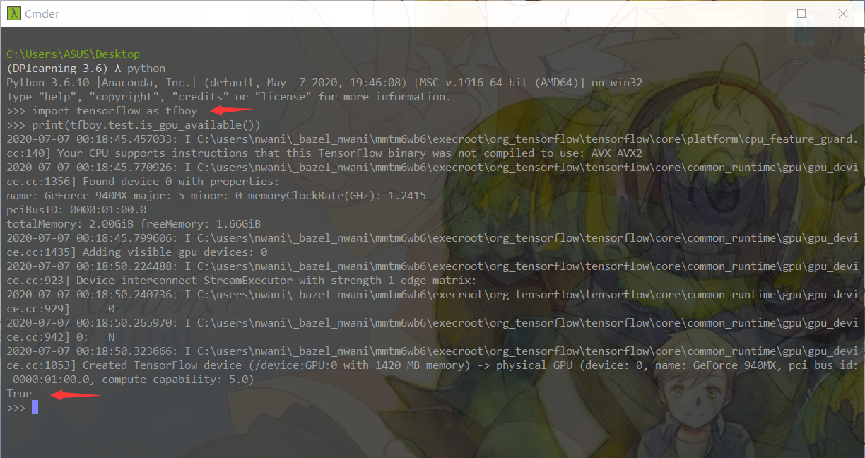 print(tfboy.test.is_gpu_available()) #显示True说明安装成功了