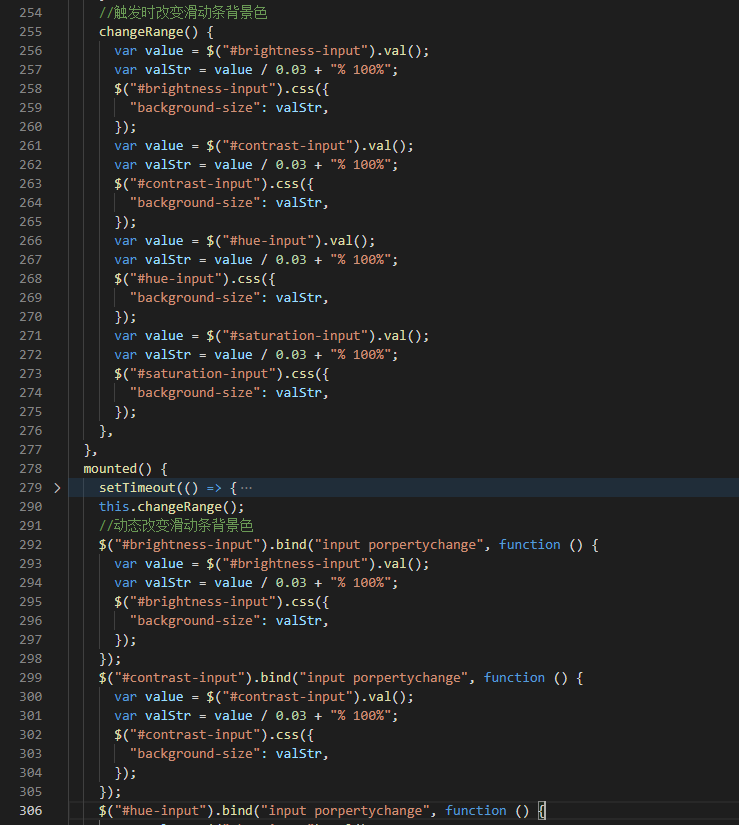 CSS能做的就到这里,最后还需要调用jQuery方法动态改变滑动条背景色。1、jQuery监听input属性改变方式:$(input的id、class).bind(“input porperty”,()=>{});2、jQuery监听input事件方式:$(input的id、class).on(“input change”,(val)=>{})。