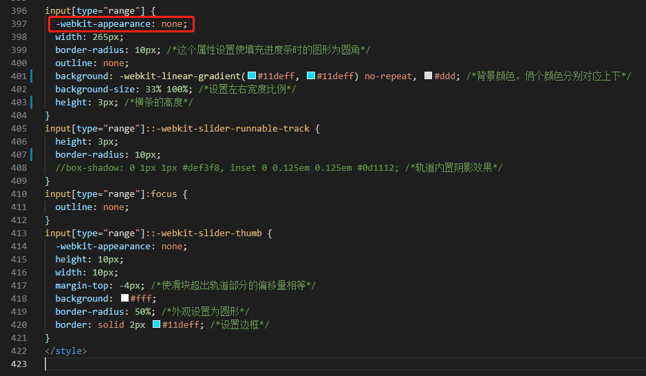 解决完取值问题,新的问题接踵而至,就是要修改input滑块标签样式。如果页面在chrome浏览器中展示,要先将input[type=”range”]元素的-webkit-appearance属性值设为none,如下图红框所示,然后再通过::-webkit-slider-runnable-track修改轨道样式,并通过::-webkit-slider-thumb修改滑块样式。