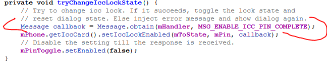 - MSG_ENABLE_ICC_PIN_COMPLETE:开启/关闭 sim锁定。如果sucess为true,则说明成功的进行了锁定sim卡或者解锁sim卡。更新mPinToggle的check状态。如果为false,说明操作失败,给出toast提示。