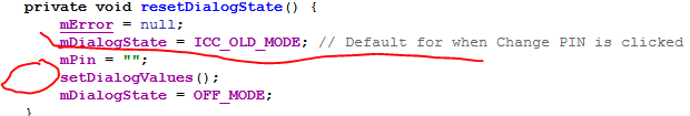 当我们点击要修改PIN时,mDialogState就会设置为ICC_OLD_MODE,接着就会执行setDialogValues()函数。