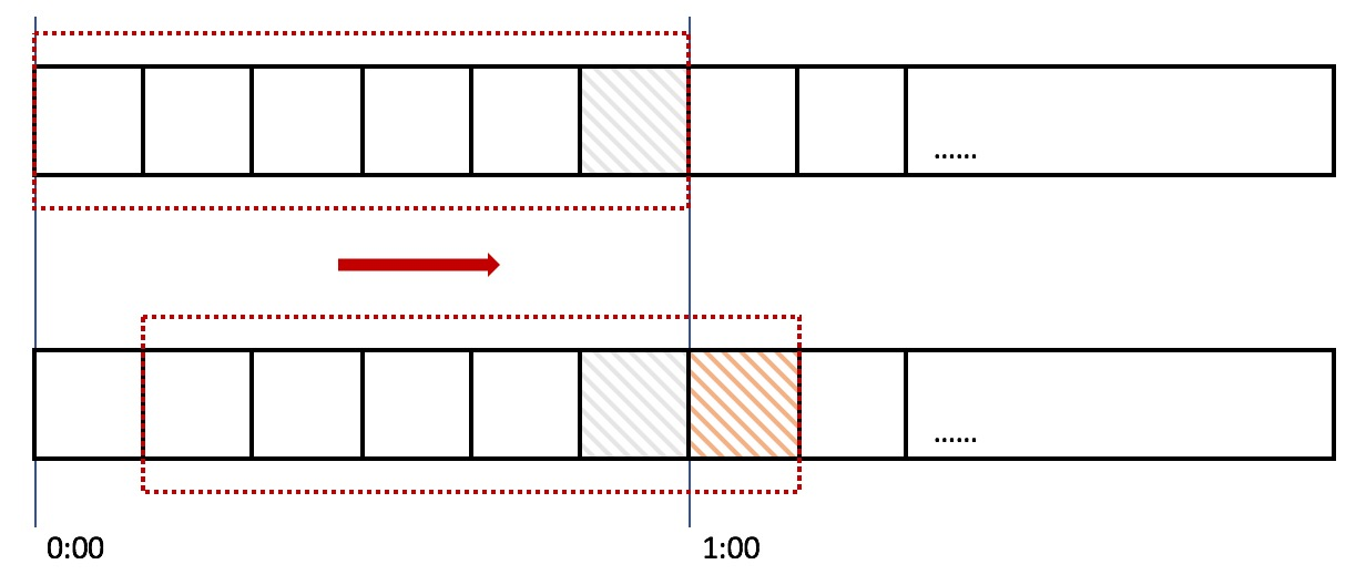 那么滑动窗口怎么解决刚才的临界问题的呢?我们可以看上图,0:59到达的100个请求会落在灰色的格子中,而1:00到达的请求会落在橘黄色的格 子中。当时间到达1:00时,我们的窗口会往右移动一格,那么此时时间窗口内的总请求数量一共是200个,超过了限定的100个,所以此时能够检测出来触 发了限流。