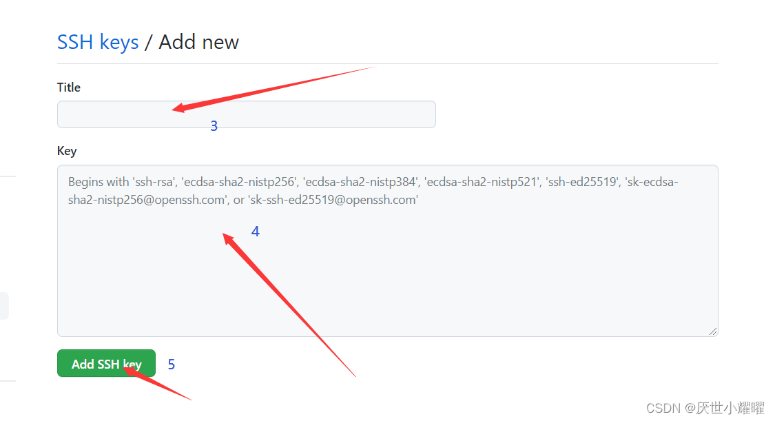 登录Github,找到右上角的图标,打开点进里面的Settings,再选中里面的SSH and GPG KEYS,点击右上角的New SSH key,然后Title里面随便填,再把刚才id_rsa.pub里面的内容全部复制到Title下面的Key内容框里面,最后点击Add SSH key,这样就完成了SSH Key的加密。
